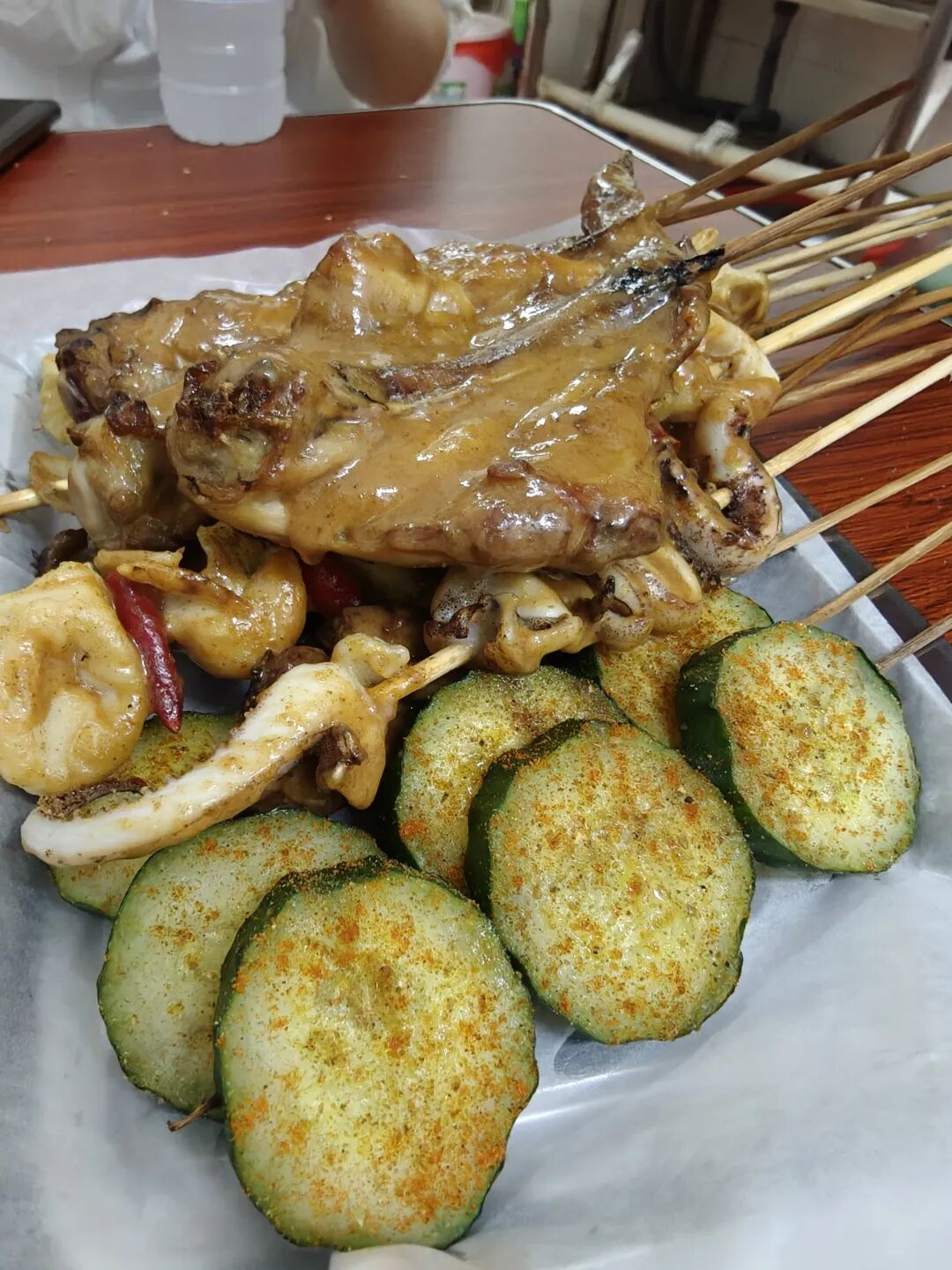 烤鸡腿挺好吃,鱿鱼鸡胗什么的也不错,还有一个脆肚之类的东西口感很好,素的一般。